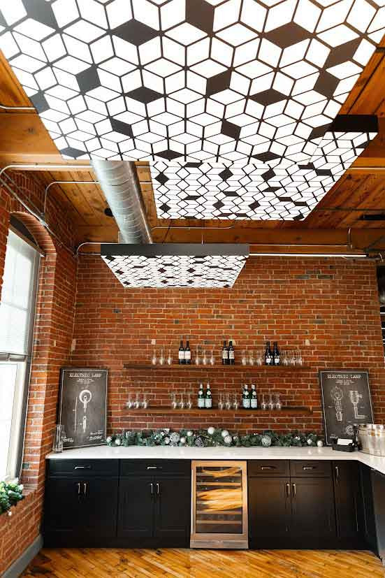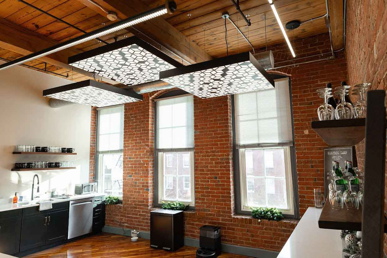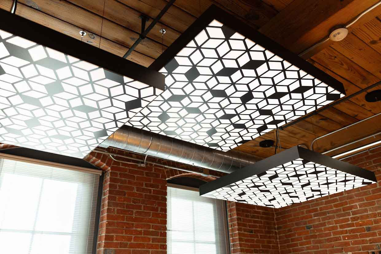 These Faux Perforated Metal FABRILum luminaires enhance the rustic but sophisticated aesthetic of this renovated space. Printed perforated metal patterns enable the appearance of metal designs without the weight and expense associated with using the actual materials.