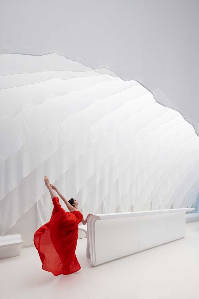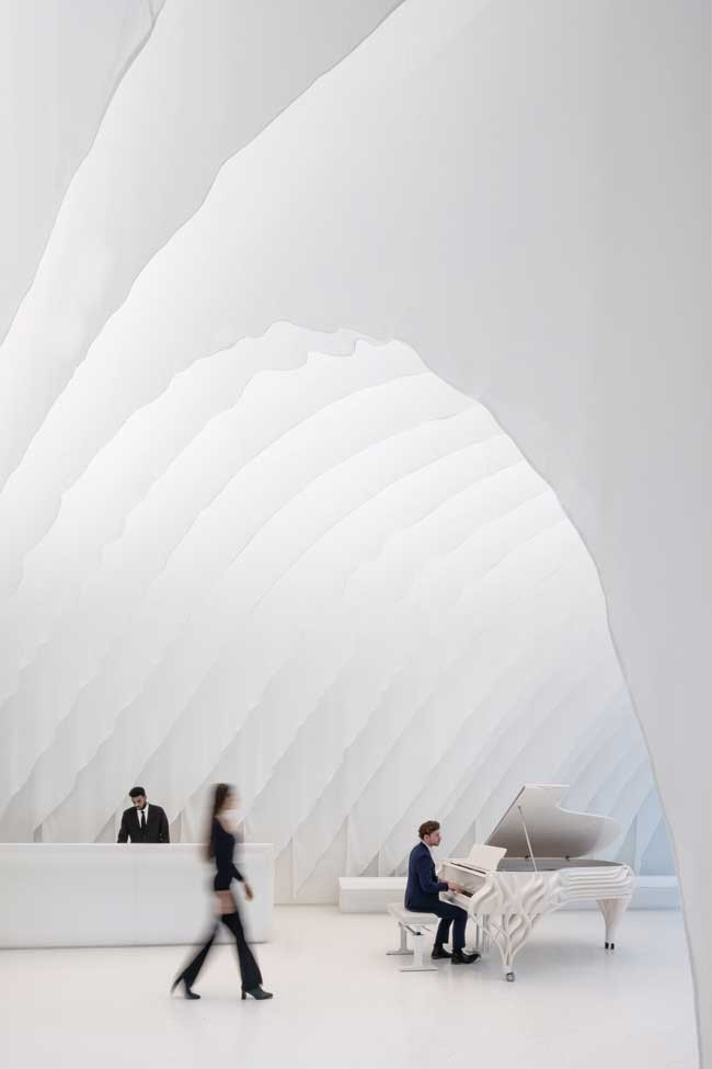 A Cooledge SkySpan luminous ceiling forms the backdrop for this ethereal lobby, illuminating the space through layers of fabric that inspire the transient nature of clouds. Tunable white light allows for a multitude of effects while music from a hand-built Fazioli piano creates a soothing ambience.
