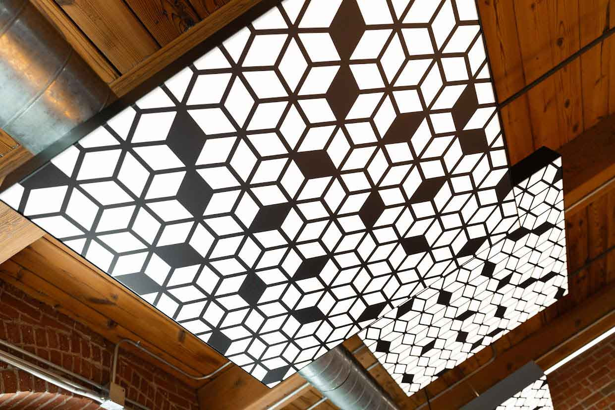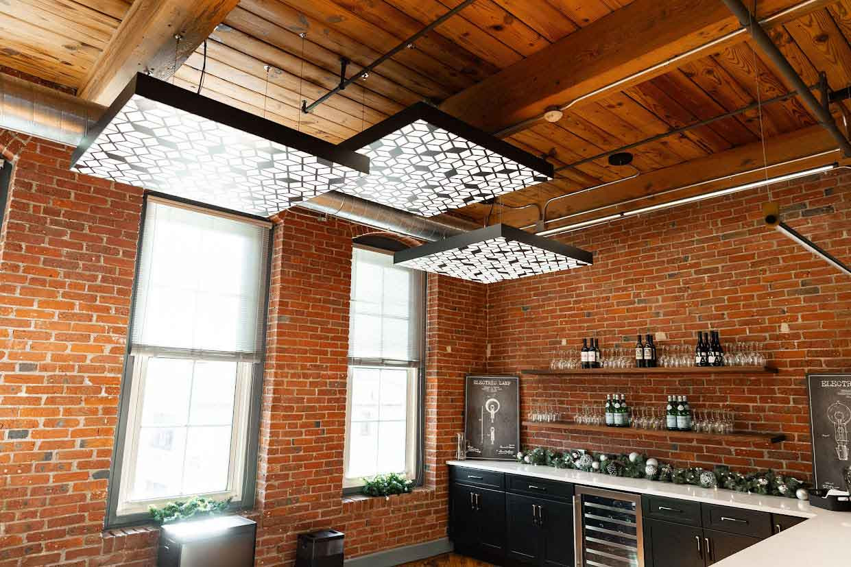 These Faux Perforated Metal FABRILum luminaires enhance the rustic but sophisticated aesthetic of this renovated space. Printed perforated metal patterns enable the appearance of metal designs without the weight and expense associated with using the actual materials.